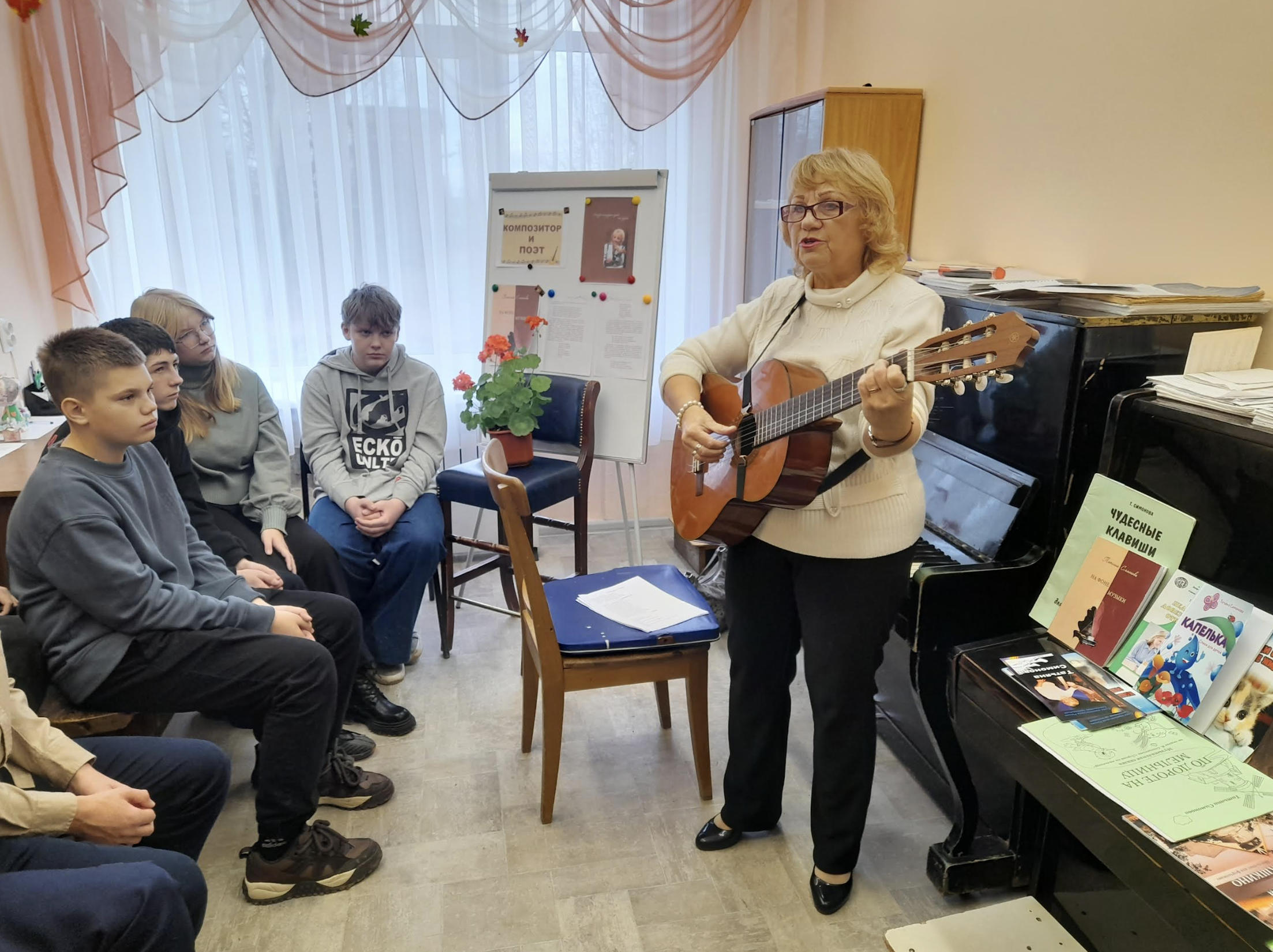 Татьяна Робертовна Симонова – композитор и поэт, кандидат педагогических наук, заслуженный работник культуры РФ, член Союза композиторов РФ. На встрече Татьяна Робертовна познакомила молодёжную аудиторию со своим музыкальным и литературным творчеством, а также рассказала о своей педагогической деятельности. Прозвучали стихи и песни в исполнении автора под аккомпанемент гитары и фортепиано.