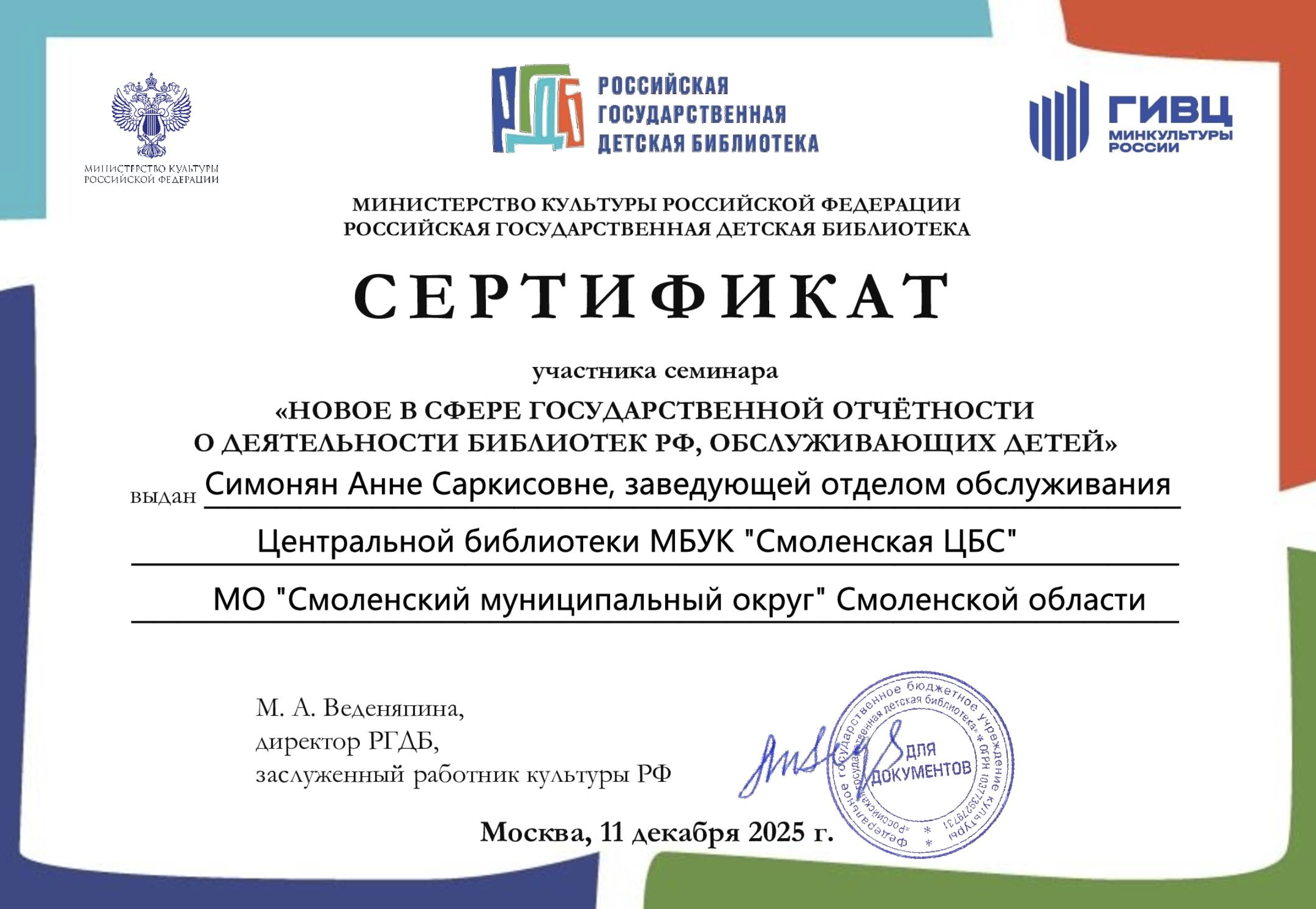 Специалисты библиотек Смоленского муниципального округа продолжают совершенствовать и обновлять свои знания, умения и навыки. В этот раз заведующая отделом обслуживания Центральной библиотеки – Симонян Анна Саркисовна приняла участие в семинаре РГДБ «Новое в сфере государственной отчетности о деятельности библиотек РФ, обслуживающих детей». Молодец!